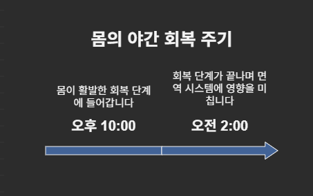 특히 우리 몸은 밤 10시부터 새벽 2시 사이에 가장 활발하게 회복 작용을 합니다. 이 시간 동안 수면을 취하지 못하면, 세포 재생에 필요한 호르몬 분비가 원활하지 않아 면역 시스템에 부담이 가게 됩니다.