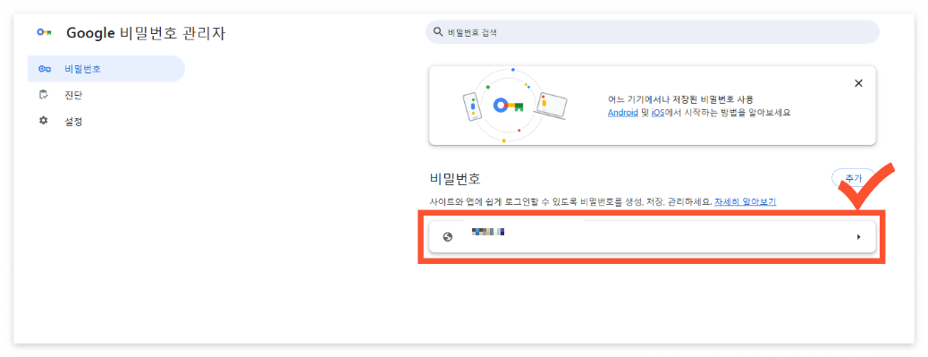(1) 구글 비밀번호 관리자 페이지로 들어가면 좌측 메뉴 비밀번호를 클릭하여 저장된 비밀번호를 클릭합니다.