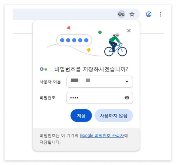 (5) 비밀번호를 저장하고 싶은 페이지 로그인을 진행하면, 우측 상단에 해당 메시지를 확인하고 저장을 클릭합니다.