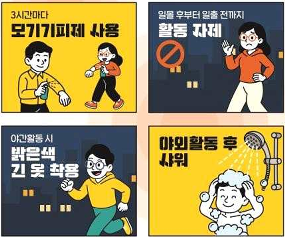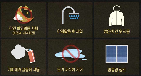 모기는 주로 해질 무렵부터 새벽 사이에 활발하게 활동합니다. 이 시간대에는 가능하면 야외활동을 삼가고, 불가피한 경우에는 노출을 최소화하는 노력이 필요합니다. - 야외활동 후 반드시 샤워하기