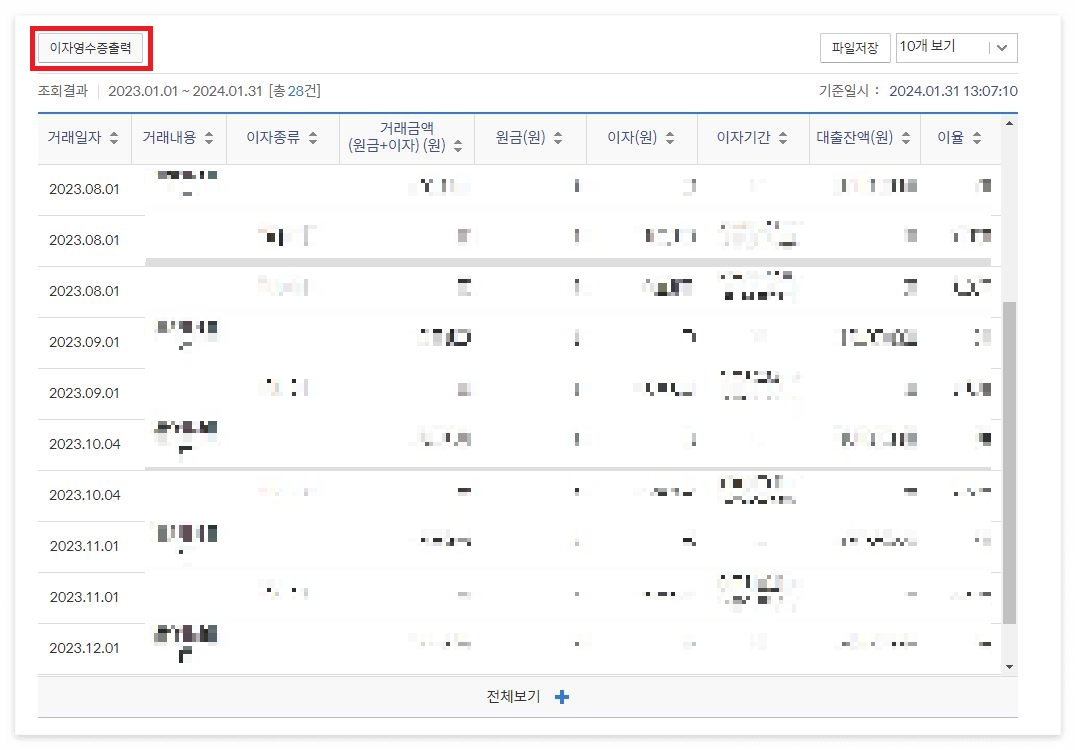 (5) 조회 후 하단의 "이자영수증출력"을 클릭하시면 해당 상품의 이자 납입내역을 확인할 수 있습니다.