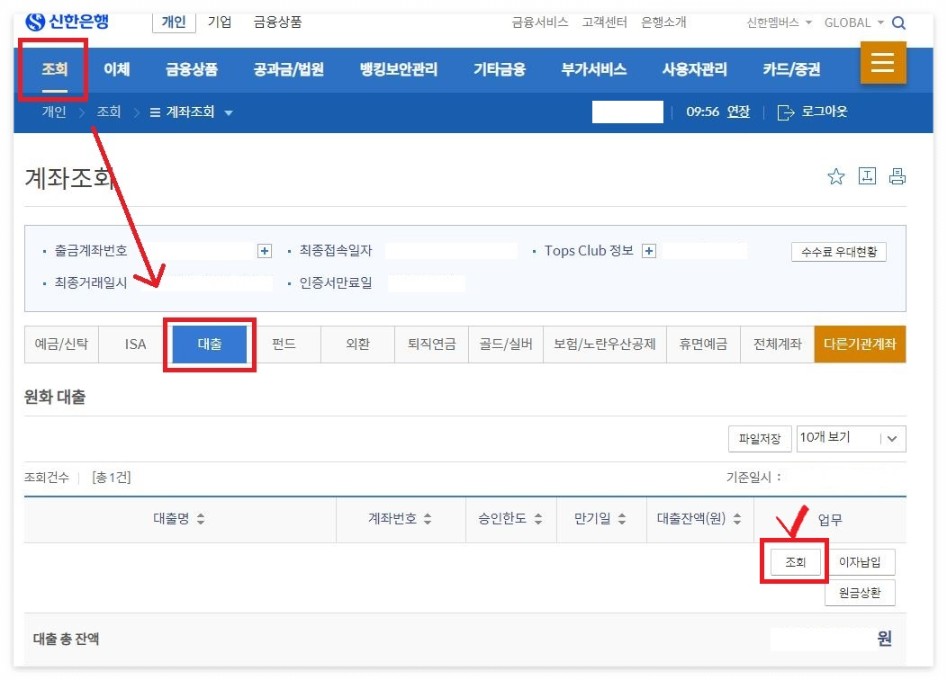 (2) 개인업무를 위한 화면 상단 [조회]>>[대출]을 클릭합니다.