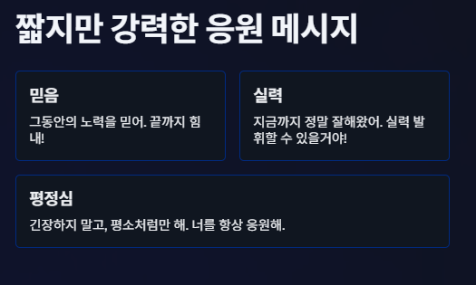 수험생에게는 복잡하고 긴 문장보다, 진심이 담긴 짧고 명료한 응원이 더욱 기억에 남고 힘이 됩니다.