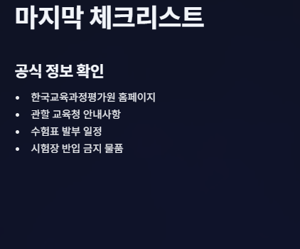마지막으로, 수험표 발부 일정 및 시험장 반입 금지 물품 등 주의사항을 다시 한번 꼼꼼하게 점검하시기 바랍니다.