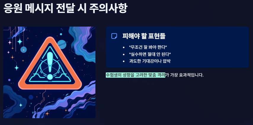 - 과도한 기대감이나 압박을 주는 문구("무조건 잘 봐야 한다", "실수하면 절대 안 된다" 등)는 수험생의 긴장감을 높일 수 있으므로 피해야 합니다.