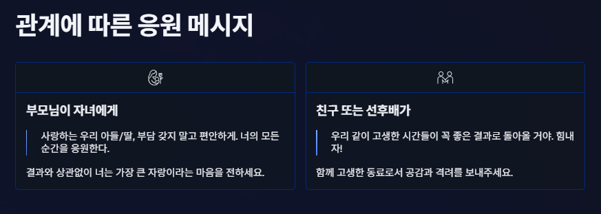 - 수험생의 성향을 고려하여, 조용한 격려가 필요할지 활기찬 응원이 필요할지 판단하는 것이 좋습니다.