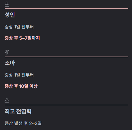 - 소아: 성인보다 길 수 있으며, 증상 발생 후 10일 이상 전염력이 있는 경우도 있습니다.