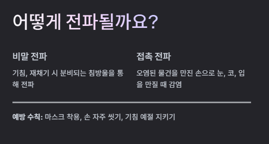 - 접촉 전파: 바이러스가 묻은 물건(문손잡이, 스위치 등)을 만진 손으로 눈, 코, 입을 만질 경우에도 감염될 수 있습니다.