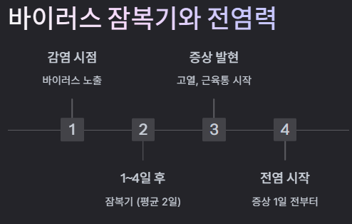 - 전염 기간은 바이러스를 배출하여 타인을 감염시킬 수 있는 시기를 의미합니다.