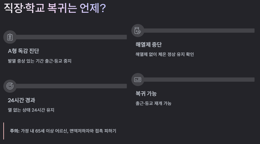 - 격리 해제 시점: 위에서 언급한 '해열제 없이 24시간 경과' 기준을 충족한 후 출근 및 등교가 가능합니다.