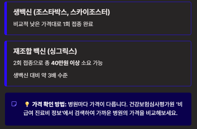 - 싱그릭스: 2회 접종 구조로 비용이 더 높음(2회 접종 시 총 34만 ~ 50만 원 수준)