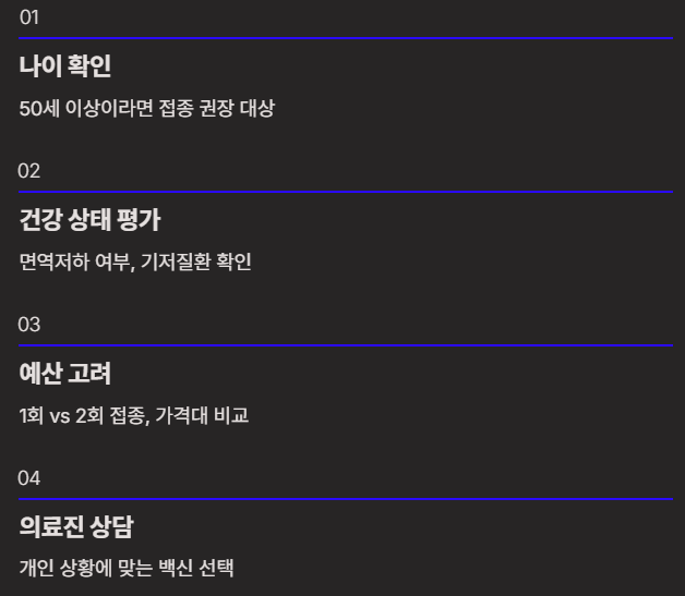 백신 선택 시 종류와 접종 횟수, 개인의 건강 상태, 예산을 모두 고려해야 합니다.