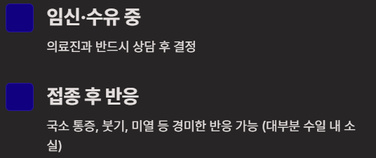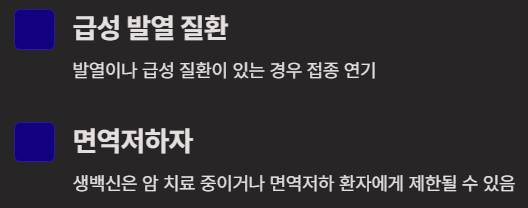 - 급성 발열 질환이 있는 경우 접종을 연기해야 합니다.