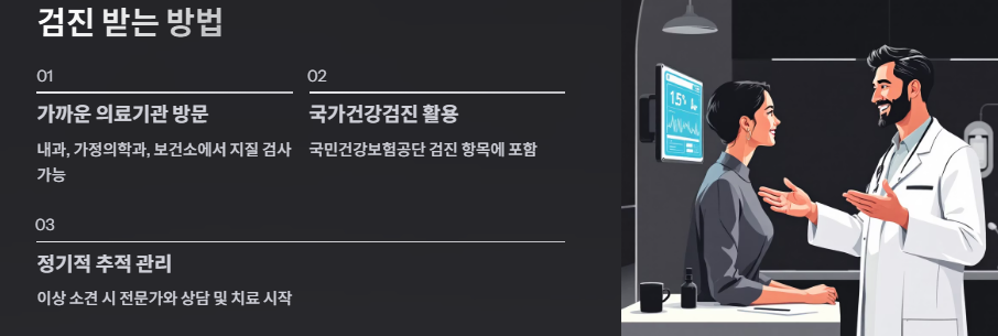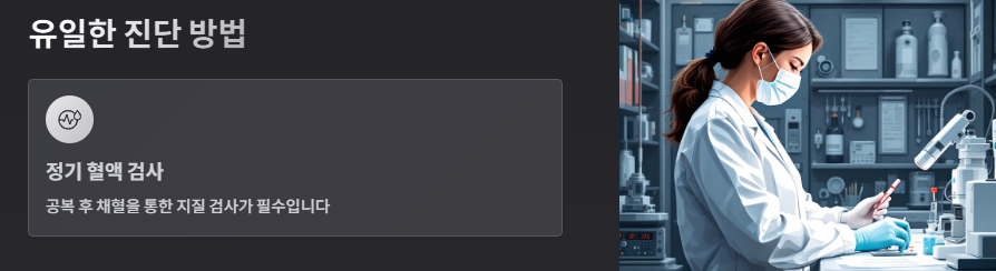 - 유일한 진단 방법은 정기적인 '혈액 검사' (공복 후 채혈)입니다.