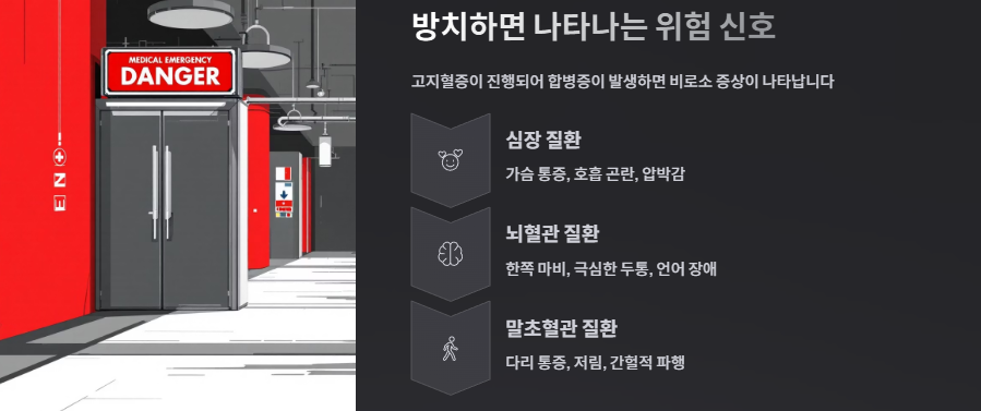 고지혈증 자체는 증상이 없지만, 이를 장기간 방치하면 과도한 지방 성분이 혈관 벽에 쌓여 '동맥경화증'을 유발합니다. 이로 인해 혈관이 좁아지고 막히면서 치명적인 합병증이 발생하며, 이때 비로소 증상이 나타납니다.