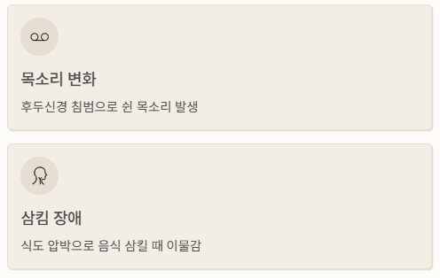 - 목소리 변화: 종양이 성대를 조절하는 신경(후두신경)을 침범하여 쉰 목소리나 목소리 변화가 발생하며, 이는 갑상선암 증상 중 중요한 신호입니다.