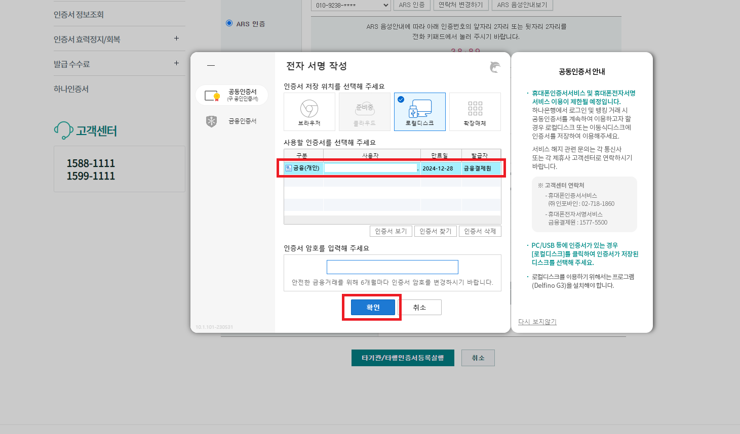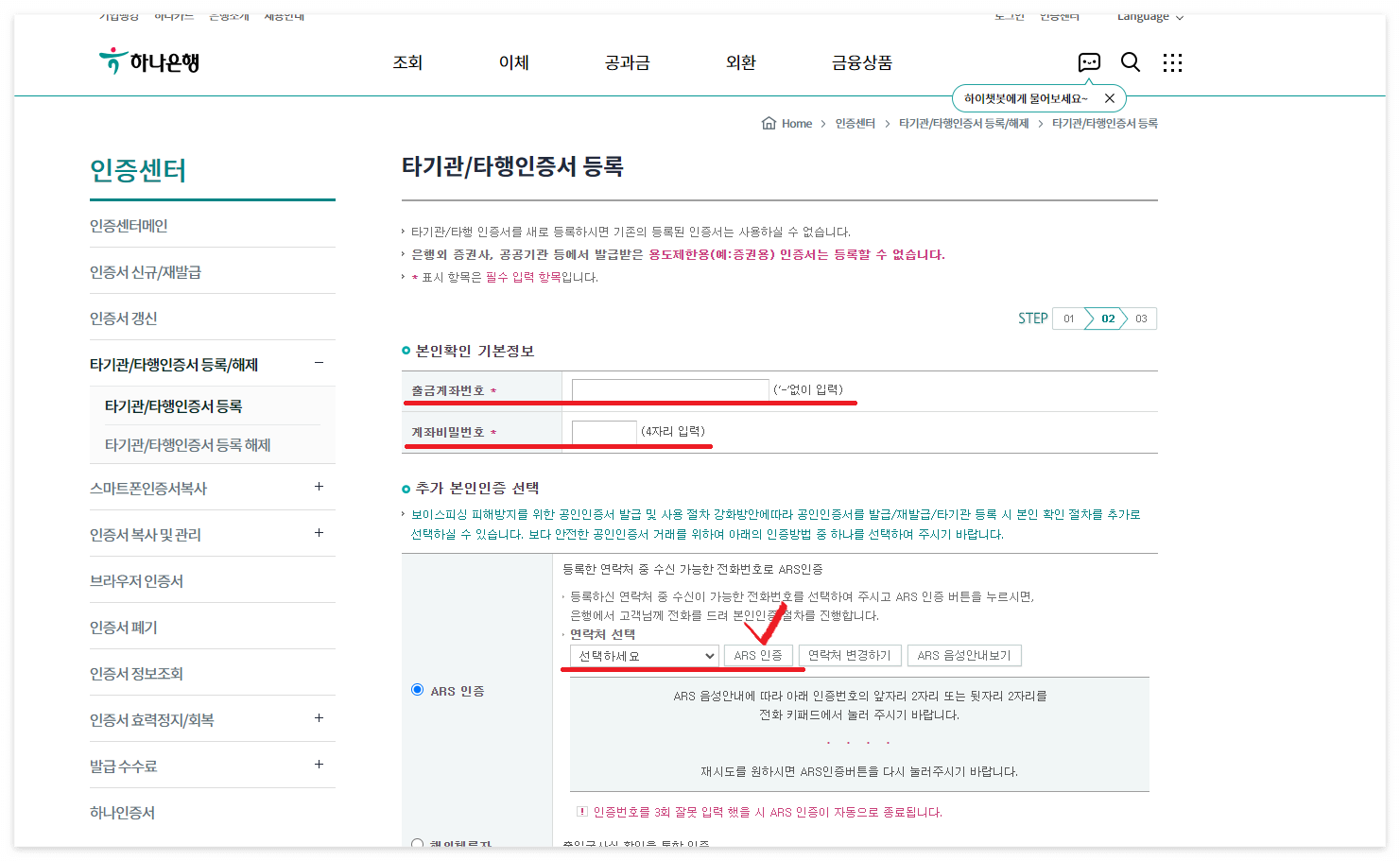 주거래은행은 신한은행인데 하나은행에 필요한 서류를 인터넷으로 출력하기 위해서는 타기관 인증서 등록이 필요합니다.