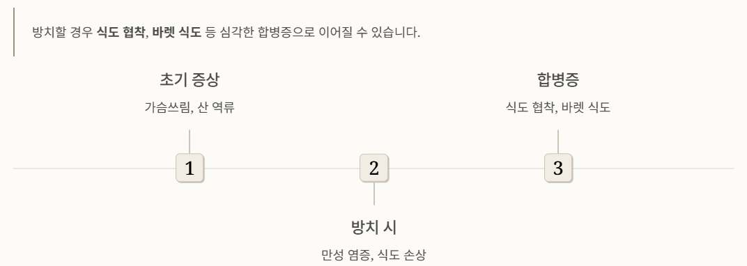 위와 같은 증상들은 일상생활의 불편함을 초래하며, 방치할 경우 식도 협착, 바렛 식도 등 합병증으로 이어질 수 있어 관리가 필요합니다.