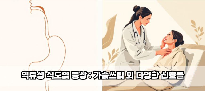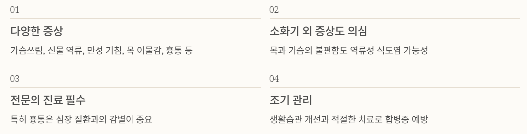요약하면, 역류성 식도염 증상은 가슴쓰림과 신물 역류 외에도 만성 기침, 목 이물감, 흉통 등 매우 다양하게 나타날 수 있습니다.