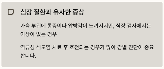 - 특징: 심장 검사에서는 이상이 없으나, 역류성 식도염 치료 후 호전되는 경우가 많습니다.