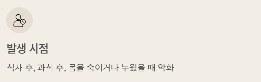 - 발생 시점: 특히 식사 후, 과식했을 때, 기름진 음식을 먹었을 때, 또는 몸을 숙이거나 누웠을 때 증상이 심해지는 경향이 있습니다.