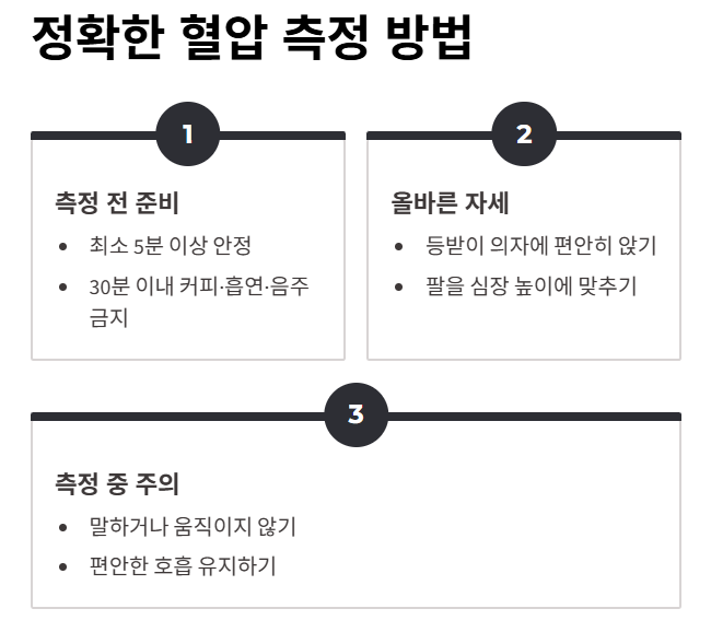 - 올바른 자세: 등받이가 있는 의자에 편안히 앉아, 팔을 심장 높이에 맞추고 측정해야 합니다.
