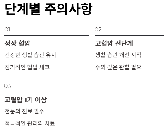 주의사항으로, 혈압 수치가 고혈압 전단계(120/80 이상)로 확인될 경우, 자가 진단에 그치지 말고 전문의와 상담하여 생활 습관 개선 및 적절한 관리를 시작해야 합니다.