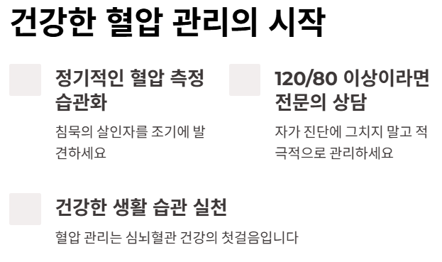 혈압 정상 수치를 아는 것은 자신의 심뇌혈관 건강 상태를 파악하는 가장 기본적이고 중요한 지표입니다. 고혈압은 증상이 없으므로, 정기적인 혈압 측정을 통해 자신의 수치를 정확히 알고 관리하는 습관이 중요합니다.