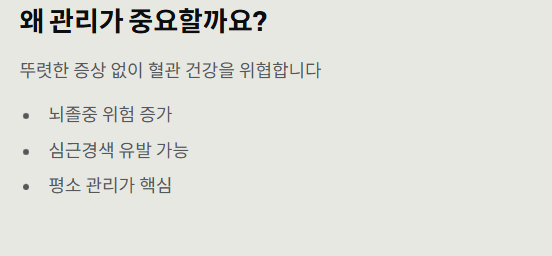 높은 혈압을 방치하면 뇌졸중, 심근경색 등 심각한 합병증을 유발할 수 있어 평소 관리가 매우 중요합니다.