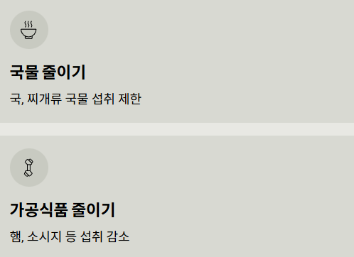 - 국, 찌개류의 국물 섭취를 줄입니다.