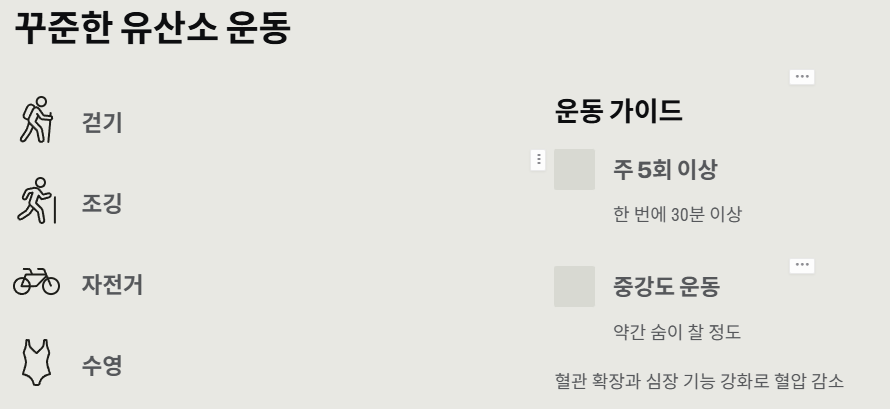 - 일주일에 5회 이상, 한 번에 30분 이상 꾸준히 실천합니다.
