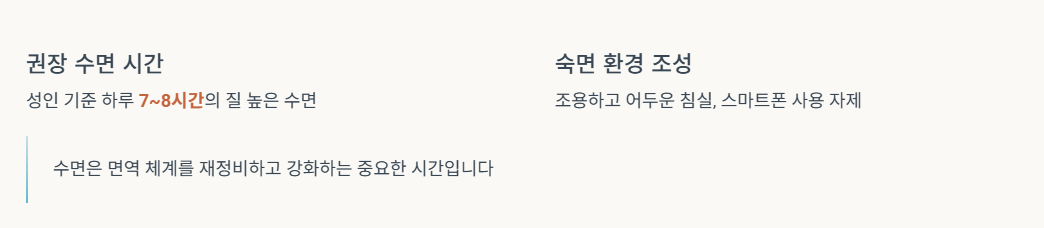 수면은 면역 체계를 재정비하고 강화하는 매우 중요한 시간입니다. 수면이 부족하면 면역 세포의 기능이 저하될 수 있습니다.