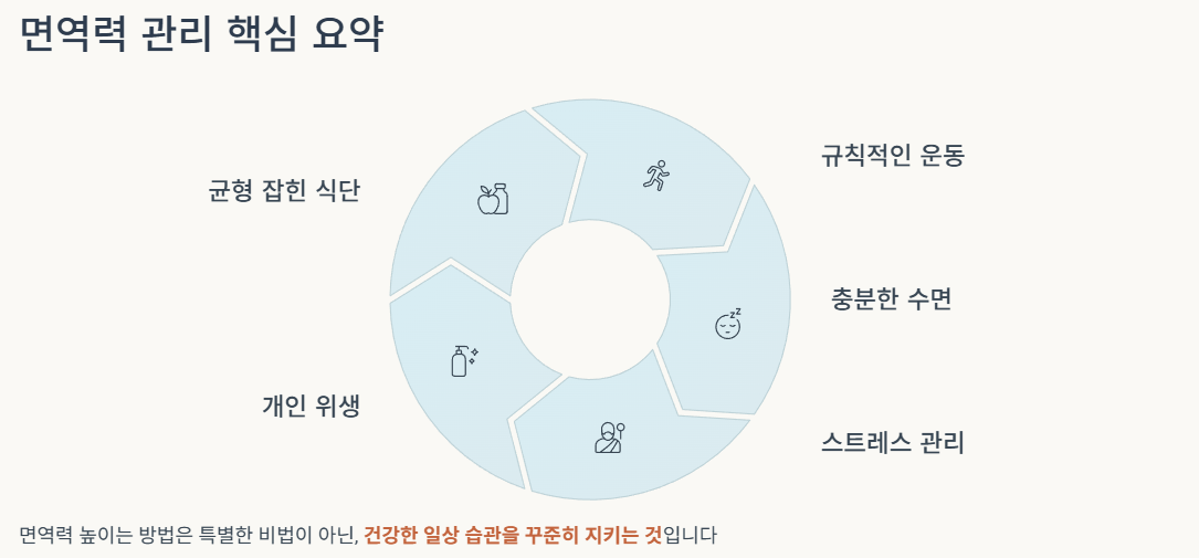 면역력은 단기간에 완성되지 않습니다. 오늘 안내해 드린 생활 수칙을 꾸준히 실천하여 건강한 방어 체계를 유지하시기 바랍니다.