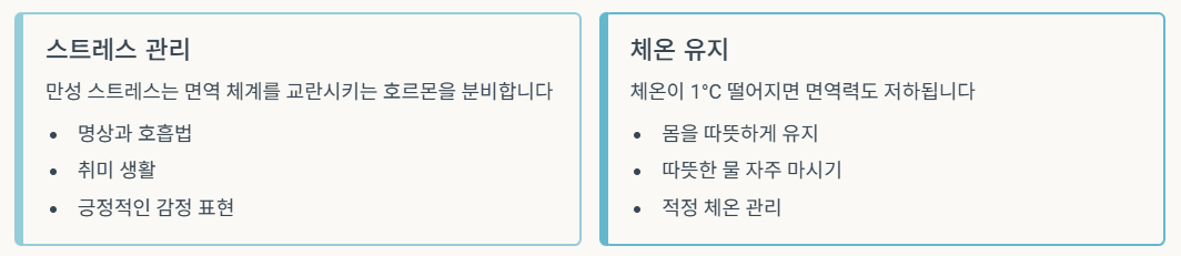 정신적 안정과 적정 체온 유지는 면역력과 밀접한 관련이 있습니다.