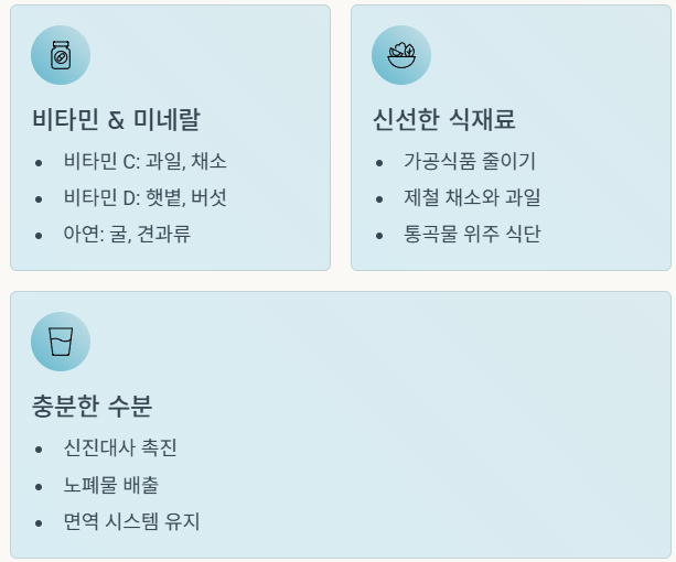 - ▶ 비타민과 미네랄: 비타민 C(과일, 채소), 비타민 D(햇볕, 버섯), 아연(굴, 견과류) 등 면역 기능에 필수적인 영양소를 충분히 섭취합니다.