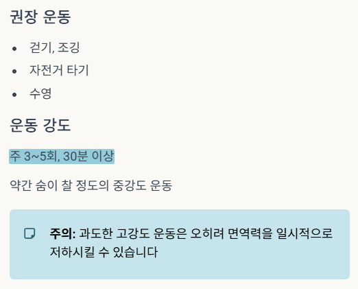 - 주의사항: 다만, 과도한 고강도 운동은 오히려 신체에 스트레스를 주어 면역력을 일시적으로 저하시킬 수 있으므로 주의해야 합니다.