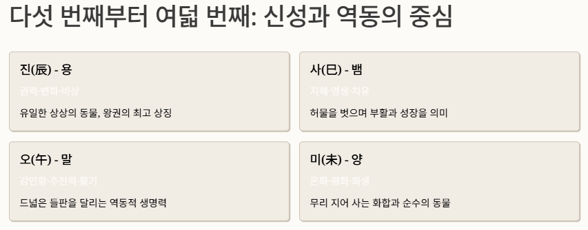 - 용과 뱀: 하늘을 나는 용은 날씨를 주관하느라 늦게 도착해 5등이 되었고, 뱀은 용의 꼬리에 붙어 있다가 6등이 되었습니다.