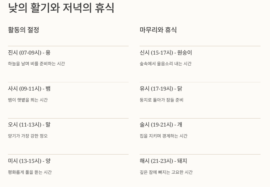 - 술시 (19시~21시) - 개: 날이 어두워지면 개들이 집을 지키기 위해 짖기 시작하거나 경계를 서는 시간입니다.
