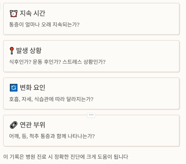 - 호흡·자세·식습관에 따라 통증이 달라지는지 여부
