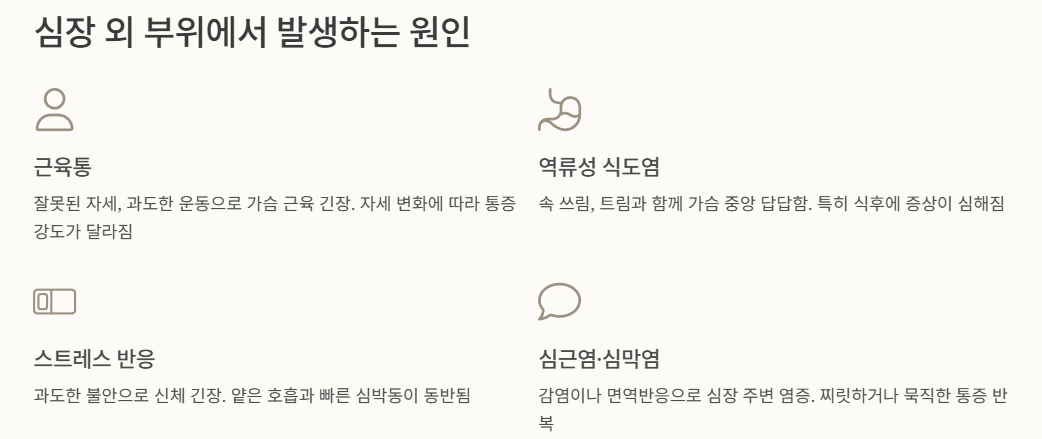 심장 통증과 혼동하기 쉽지만 호흡, 자세 변화에 따라 통증 강도가 달라지는 특징이 있습니다.