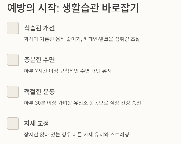 생활습관을 정비해 예방하는 동시에, 위험 신호가 있다면 즉시 의료진의 도움을 받는 것이 가장 안전한 방법입니다.