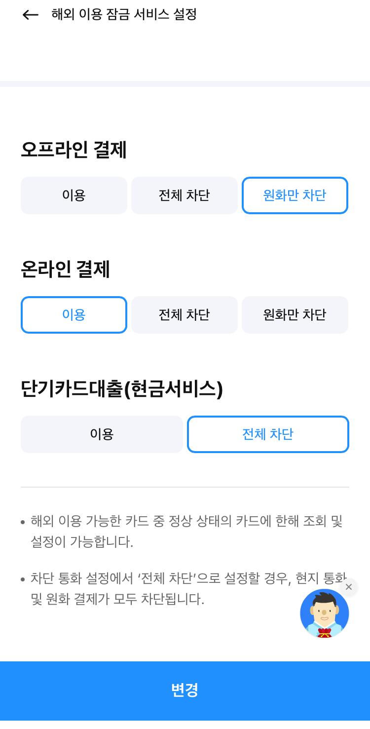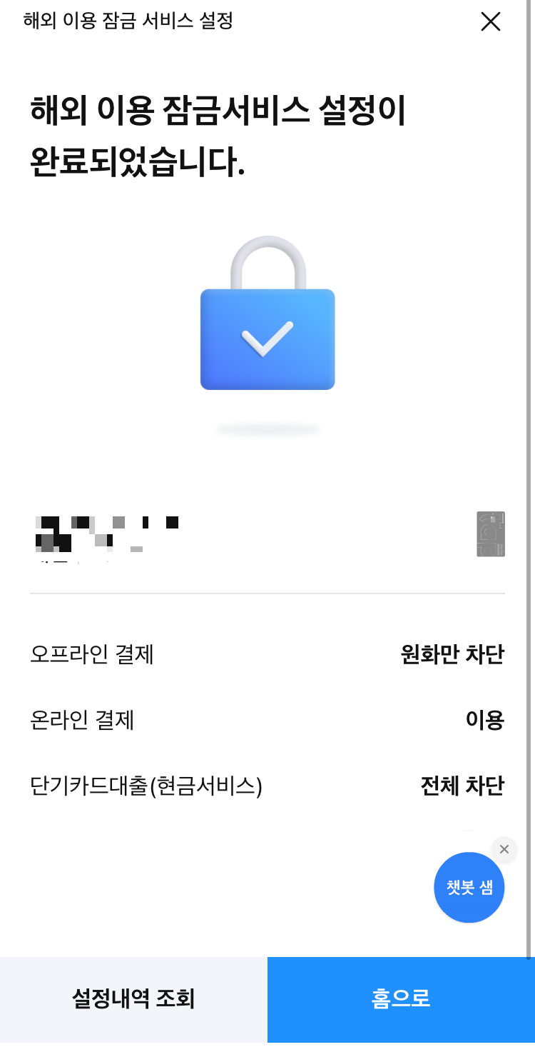 - 각 신용카드 마다 해외 이용에 대한 잠금 서비스를 제공합니다.