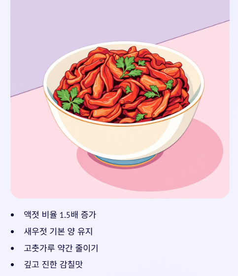 - 새우젓은 풍미를 살리는 역할이므로 기본 양을 유지합니다.