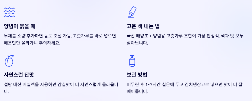 - 고춧가루를 조금 줄이고 감칠맛 위주로 맞추면 깊은 맛이 살아납니다.