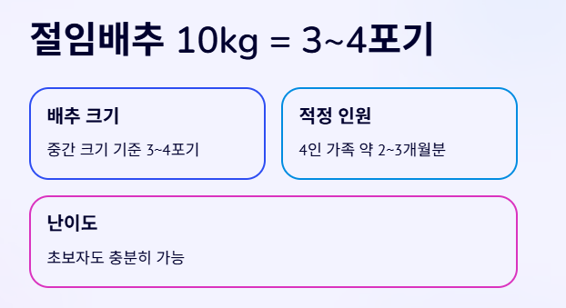 김장철이 다가오면 가장 많이 검색되는 질문이 있습니다.바로 “절임배추 10kg이면 몇 포기인가?” 하는 문제입니다.판매처마다 포기 수가 다르고, 생배추와 절임배추의 무게 차이도 크기 때문
