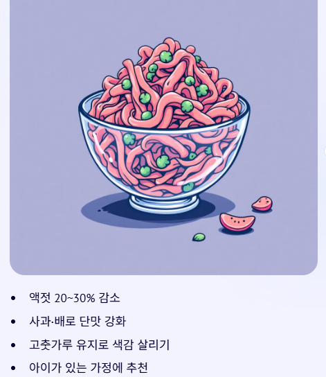- 사과·배 같은 과일을 넣어 단맛을 강화합니다.