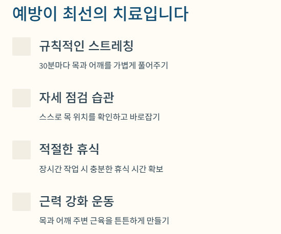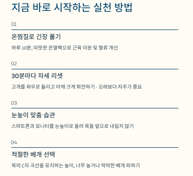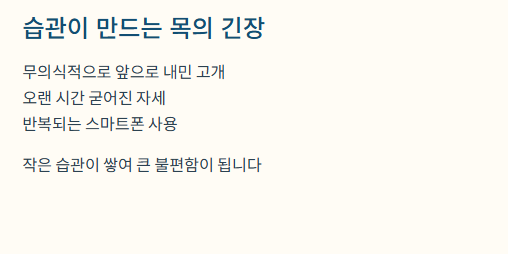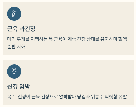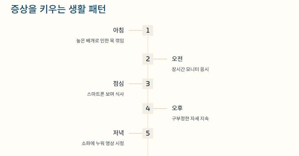 이 자세는 시간이 지날수록 목 뒤쪽 근육에게 과한 부담을 주며, 그 결과 ‘뻐근함 → 굳음 → 당김’의 흐름이 나타납니다.