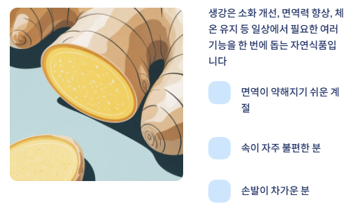 생강은 소화 개선, 면역력 향상, 체온 유지 등 일상에서 필요한 여러 기능을 한 번에 돕는 자연식품입니다.