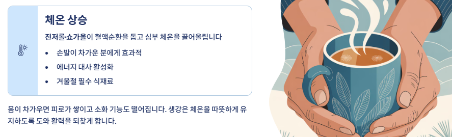 생강은 체온을 끌어올리는 데 효과적입니다. 몸이 차가우면 혈액순환이 원활하지 않아 피로가 쉽게 쌓이고 소화 기능이 떨어질 수 있습니다. 생강 특유의 매운맛 성분인 진저롤과 쇼가올이 혈액순환을 돕고, 심부 체온을 올려 몸을 따뜻한 상태로 유지하도록 돕습니다.