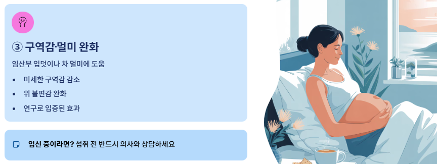 임산부의 입덧이나 차 멀미에 생강이 도움이 된다는 연구가 꾸준히 나오고 있습니다. 미세한 구역감을 줄여주고 위에서 올라오는 불편한 감각을 완화하는 데 활약합니다.